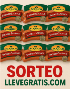 - Un año de suministro de salchichas ahumadas Eckrich, entregado en forma de 52 cupones de fabricante, cada uno válido para un paquete gratuito de salchichas ahumadas Eckrich con un valor máximo de $6 por cupón.