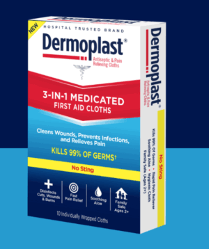 Gratis Dermoplast 3-in-1 Medicated First Aid Cloths ¡Regístrate para tener la oportunidad de obtener una muestra GRATIS de las toallitas de primeros auxilios medicadas Dermoplast